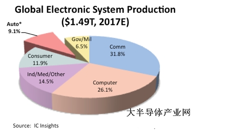 2017年全球電子系統(tǒng)市場規(guī)模預(yù)計將達(dá)到1.49兆美元,其中汽車市場占到9.1%,略高于2015年的8.9%以及016年的9%。 IC Insights指出,汽車在全球電子系統(tǒng)中的占有率近年來一直在微幅提高,并預(yù)計將維持這一緩慢成長態(tài)勢至2021年,屆時,在汽車電子產(chǎn)品將在全球電子系統(tǒng)市場銷售占9.8%。