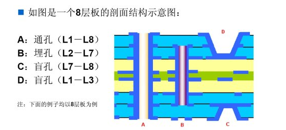 面板中不可能存在埋孔和盲孔,只有通孔。埋孔和盲孔至少在4層板中才有。通孔是從最頂層到最底層都連通了的孔;盲孔是只有一端在表層,比如下圖的C一端是在底層L8,D的一端是在頂層L1。
